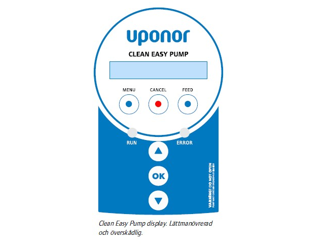 Installera en Clean Easy Pump för fosforrening på minst 70 % av ditt avloppsvatten på befintlig infiltration eller markbädd, som är godkänd enligt HVMFS 2016:17. Clean Easy Pump monteras på Uponors flockningsmedelsdunk och placeras t ex under en diskbänk. Den är säker och enkel att använda, lätt att programmera och installera. Dessutom är den underhållsfri, har en lättöverskådlig display och larmar när du behöver fylla på flockningsmedel.